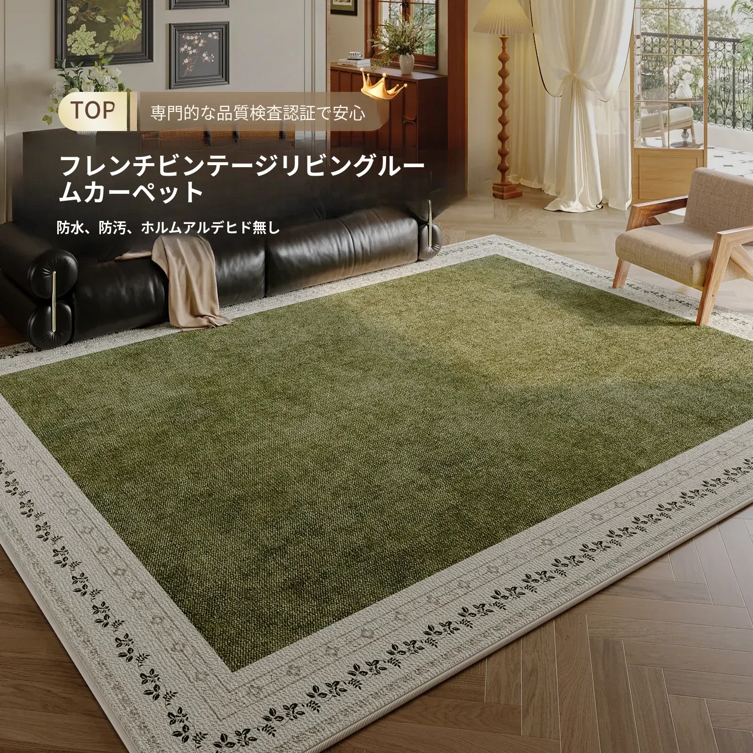 2026年新作!フランス風の中古スタイル、グリーンの防水カーペット。リビング、ソファ、コーヒーテーブルに最適!お手入れ簡単で、寝室にもぴったりな洗濯不要のマットです。快適さとスタイルを兼ね備えた一品!