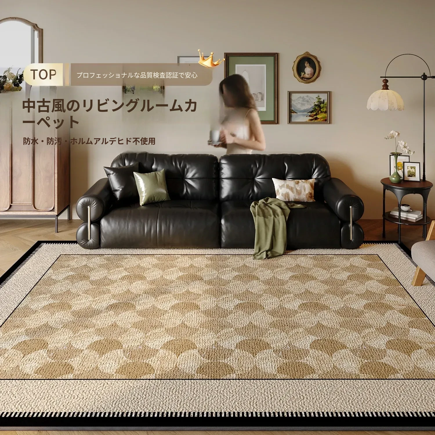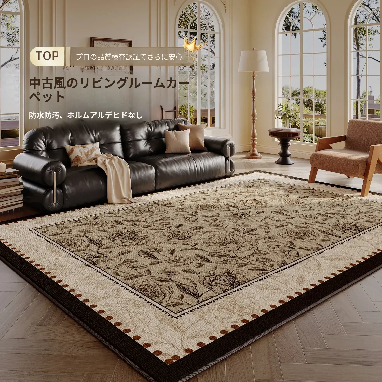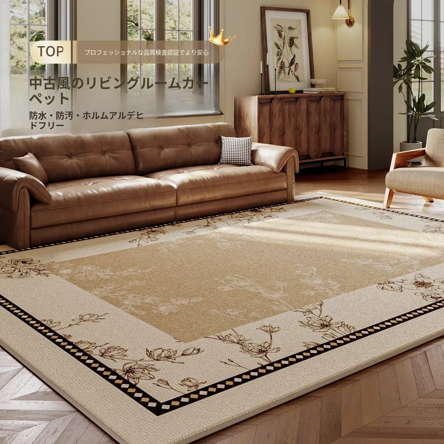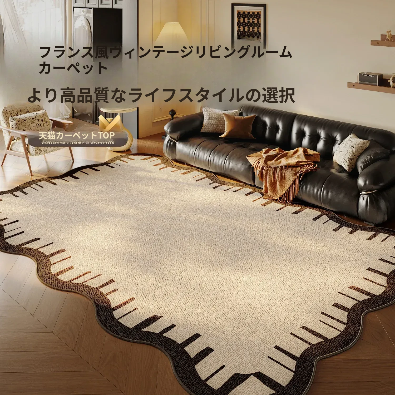 フレンチビンテージスタイルのリビングルームカーペット|高級感あふれる防水&洗濯不要|厚手の滑り止めマットで快適な寝室にも最適!おしゃれな異形デザインでインテリアを格上げ!